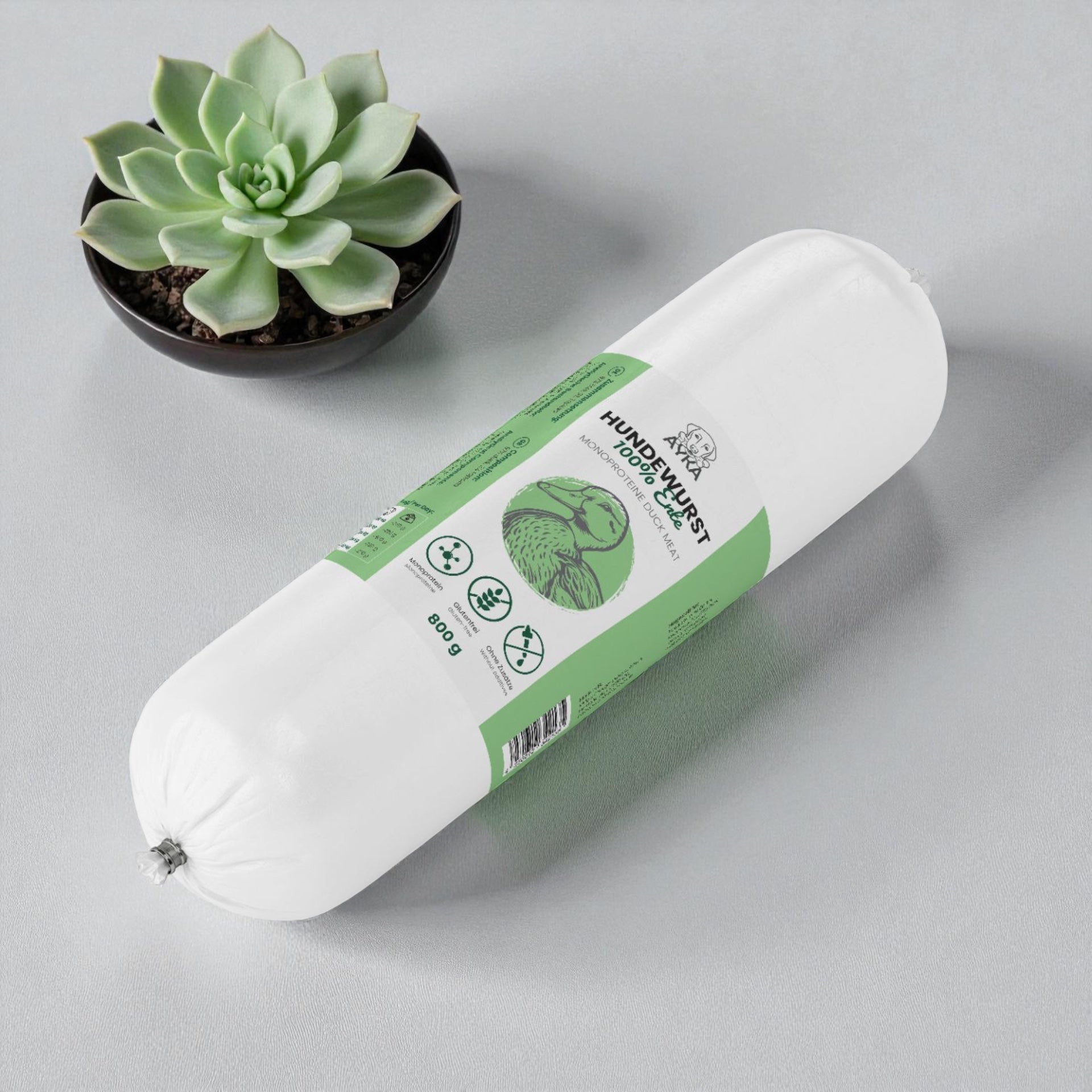 Naša pasja klobasa Ayka je popolnoma brez konzervansov in je sestavljena iz 97 % čistega račjega mesa in 3 % tapioke. (Tapioka je skoraj brezokusen škrob, pridobljen iz korenine kasave!) Za proizvodnjo se naravno govedina kuha zelo nežno.