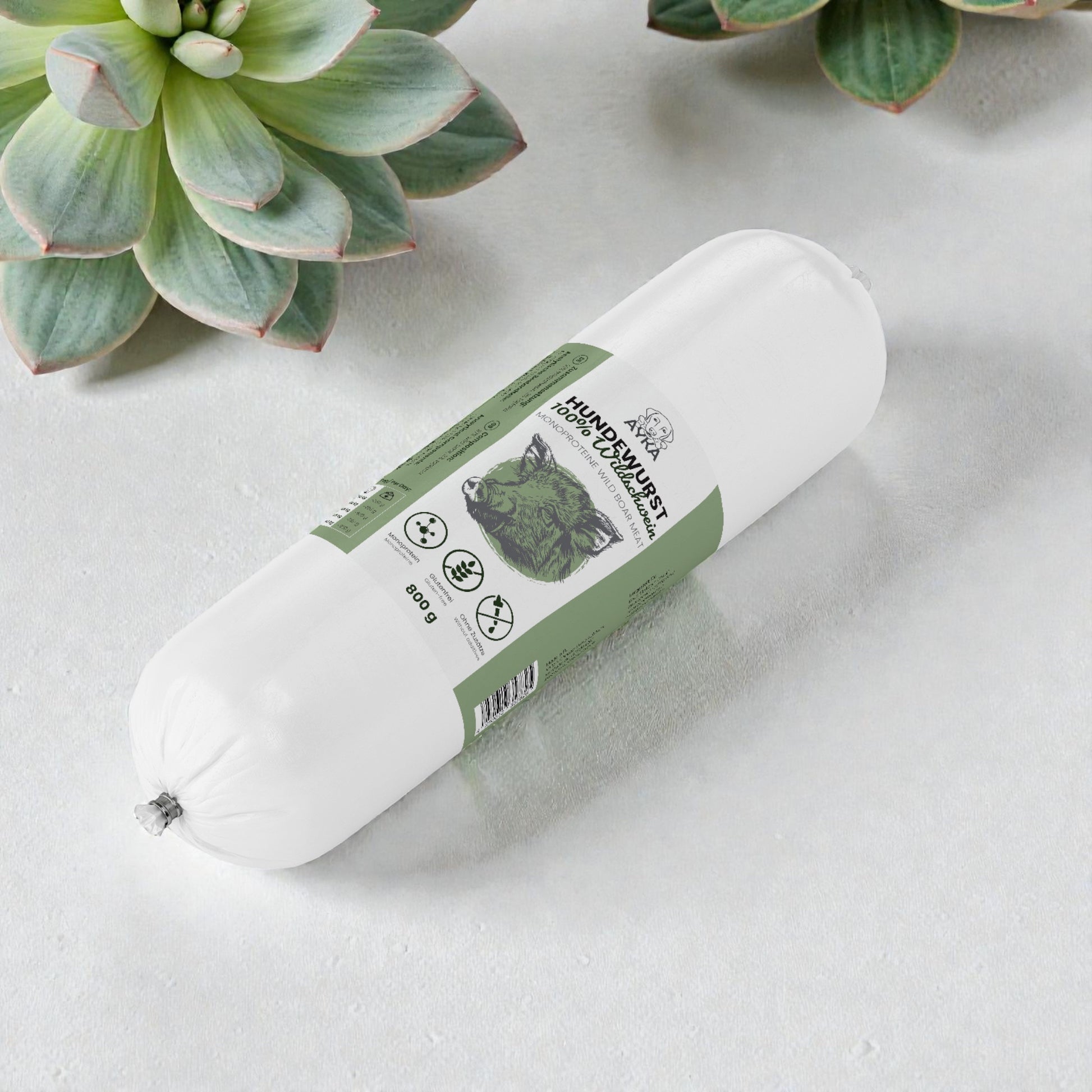 Naša pasja klobasa Ayka je popolnoma brez konzervansov in je sestavljena iz 97 % čistega mesa divjega prašiča in 3 % tapioke. (Tapioka je skoraj brezokusen škrob, pridobljen iz korenine kasave!) Za proizvodnjo se naravno meso divjega prašiča kuha zelo nežno.